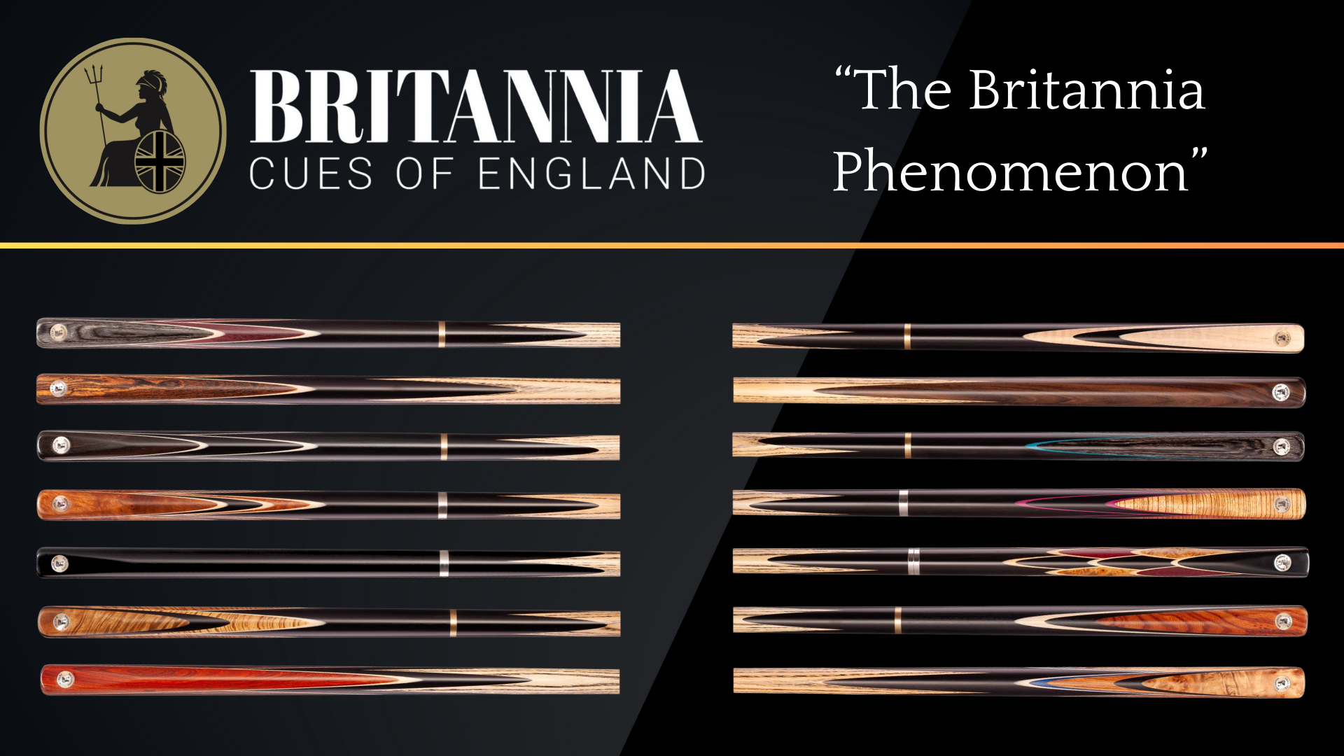 The full collection of Britannia Champion Range Snooker Cues.