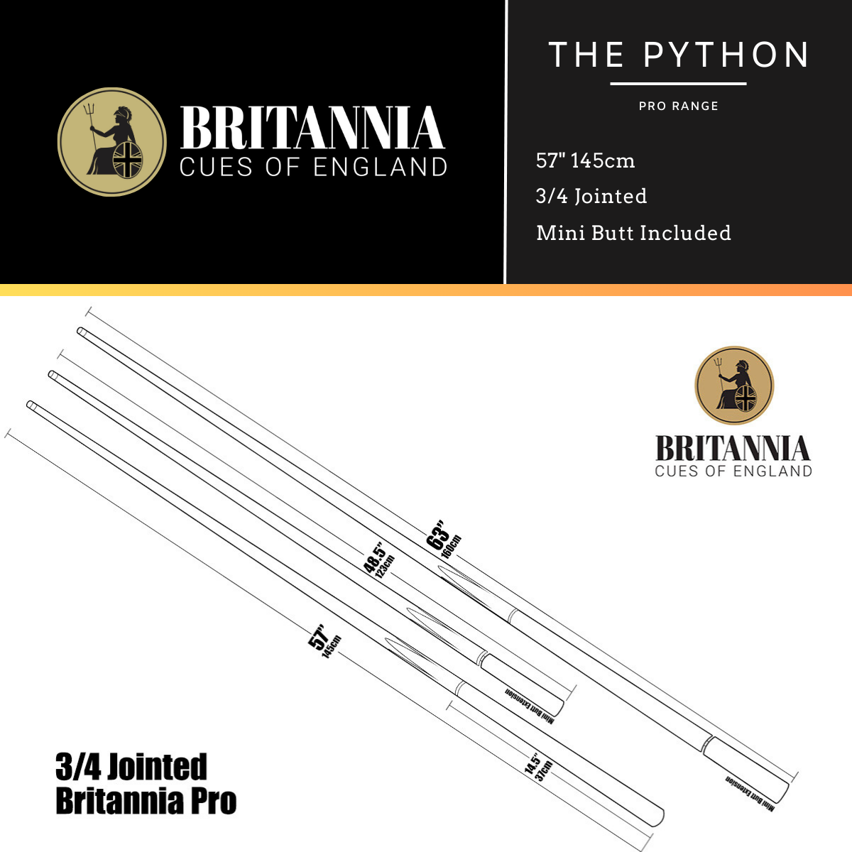 Britannia English Pool Cue 3/4 Jointed Pro Range Python 57" 145cm