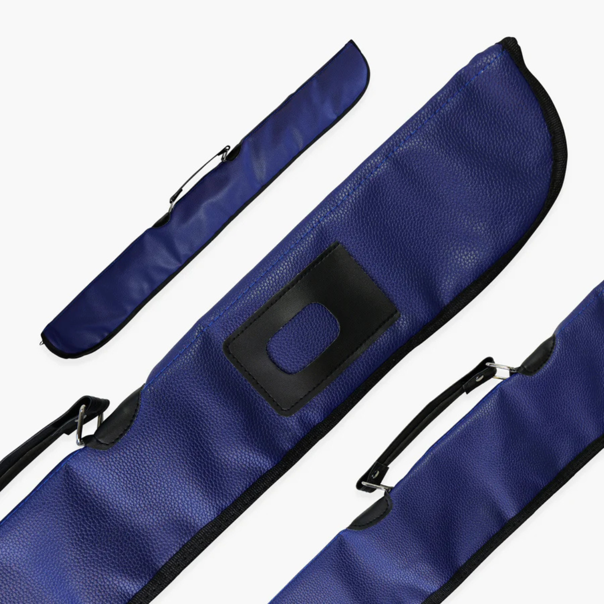 A navy blue vinyl soft cue case with padding designed to protect the cue and provide a suitable carrying solution. Simple, easy, effective.