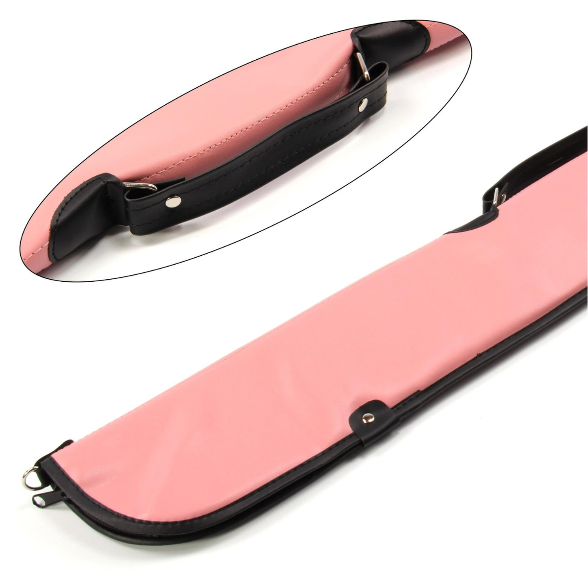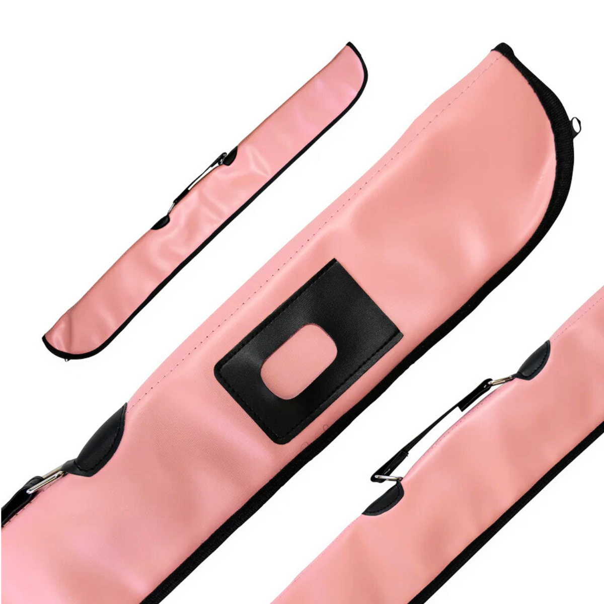 A pink vinyl soft cue case with padding designed to protect the cue and provide a suitable carrying solution. Simple, easy, effective.