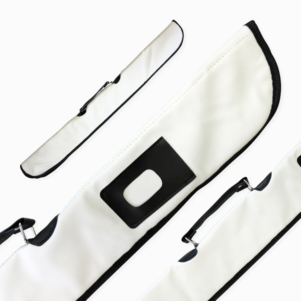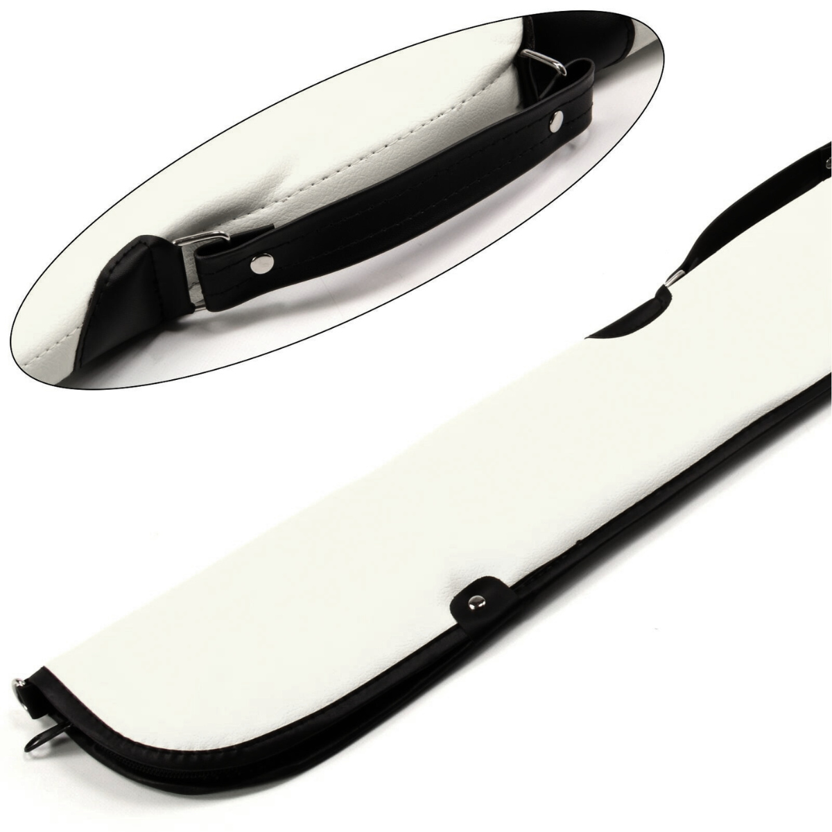 A white vinyl soft cue case with padding designed to protect the cue and provide a suitable carrying solution. Simple, easy, effective.